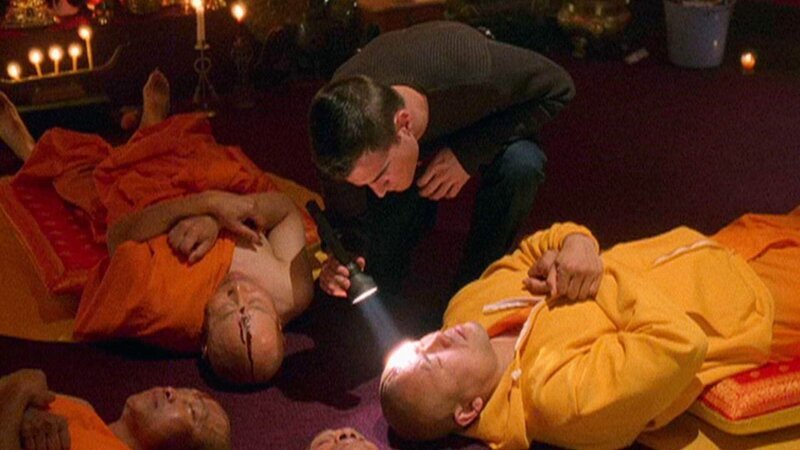Nick (George Eads) untersucht die Leichen der vier Mönche, die durch einen gezielten Schuss in die Stirn starben.Bild: MG RTL DIn einem Buddhistentempel werden vier Mönche durch Schüsse in die Stirn ermordet. Nachdem das C.S.I.-Team zunächst den Vorsteher Ananda fälschlich verdächtigt hatte, bittet Grissom einen hohen Offizier der Air Force um Satellitenbilder. Auf diesen ist zu sehen, dass der Wagen eines Restaurantbesitzers zur Tatzeit vor dem Tempel geparkt war. Doch der Mann hat ein wasserfestes Alibi, und auch sein Sohn kann nach einigen Nachforschungen als Täter ausgeschlossen werden. Offensichtlich hat der Mörder mit Absicht Spuren gelegt, die in eine Falsche Richtung führen. Ein Kaugummi, den der Mörder nachlässig an eine Buddha-Figur geklebt hatte, bringt das Teamdennoch auf die richtige Fährte … Unterdessen wird Catherine von ihrer Vergangenheit eingeholt. In ihrer Jugend war sie Striptease-Tänzerin in einem Nachtlokal – bis der Polizeibeamte Jimmy Tadero ihr kriminalistisches Talent entdeckte und sie zur Polizei holte. Ein Fall aus jener Zeit ist jedoch bisher nicht aufgeklärt: Ein Mann namens Kelso, der einen Mord gestanden hatte, soll auch ihre damalige beste Freundin Stephanie ermordet haben. Catherine geht der Sache noch einmal nach und macht eine erschreckende Entdeckung: Jimmy Tadero hatte damals offenbar Beweise verfälscht, um Kelso den Mord in die Schuhe zu schieben … (Text: VOX) Deutsche TV-Premiere Mi. 08.01.2003 VOX Original-TV-Premiere Do. 07.03.2002 CBS