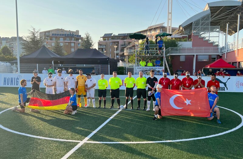 Ali Can Pektas (3.v.l.) bei einem Spiel der Deutschen Nationalmannschaft im Blindenfußball gegen die Auswahl der Türkei. Alis großer Traum ist es mit der Nationalmannschaft an den Paralympics teilzunehmen.