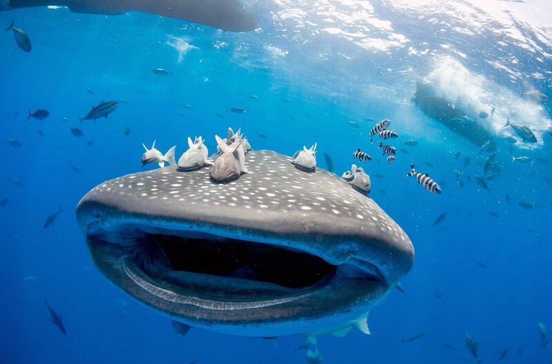 Walhaie und Thunfische sind nicht nur Reisegefährten, sondern arbeiten bei der Nahrungsjagd aktiv zusammen: Sie treiben kleinere Fische zusammen, umzingeln und attackieren sie – eine Taktik, von der beide Arten profitieren.