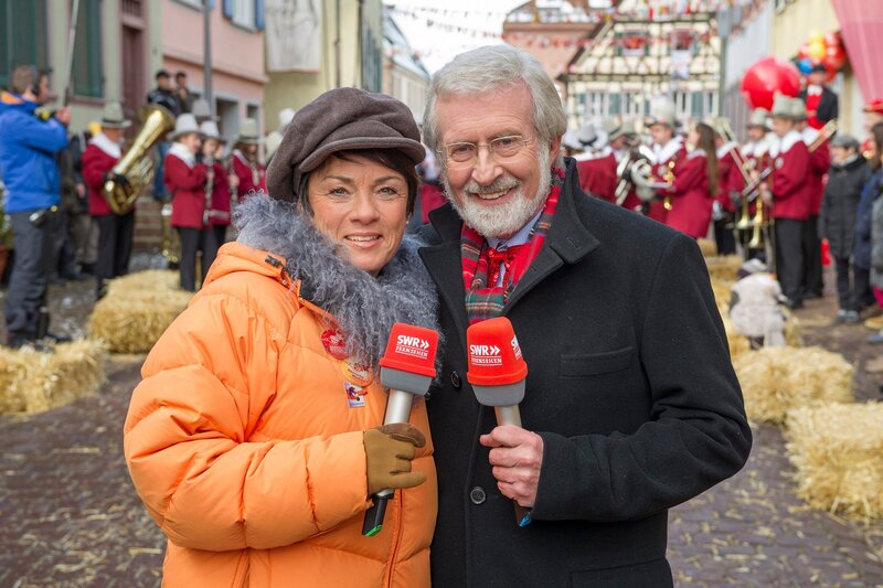 SWR-Moderatorin Sonja Faber-Schrecklein und Fastnachtsexperte Werner Mezger kommentieren das bunte Treiben in Tettnang.