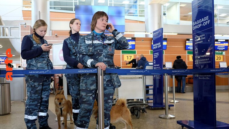 50 Hunde leben in den Zwingern der Aufzuchtstation am Rand von Moskau. Welpen, Halbwüchsige und erwachsene Hunde. Jelena Batajewa ist die Direktorin des kynologischen Zentrums – der Hundetrainingsstation – die der Sicherheitsdienst der Aeroflot unterhält. 25 Mitarbeiter kümmern sich hier rund um die Uhr um die Hunde – ihr Alltag besteht aus Spielen, Trainieren und den Einsätzen am Flughafen. Nur zum Schlafen und Fressen werden sie in den karg anmutenden Zwingern untergebracht. „Es sind Hybride aus dem Arktischen Laika und zu einem Viertel aus einem Schakal.