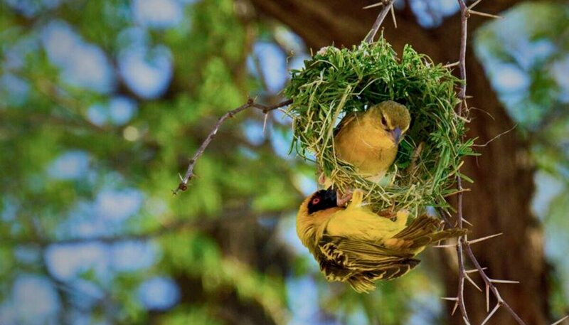 Webervögel bauen ein Nest.