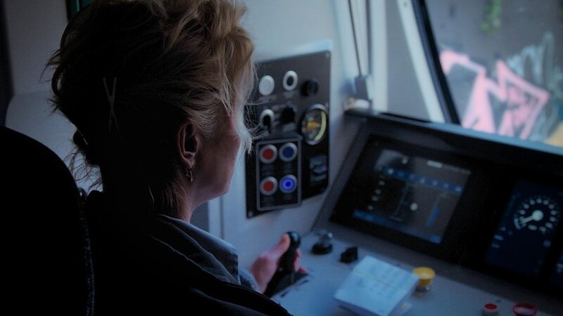 Jelena Talbot sitzt im Führerstand und fährt einen Zug +++ Die Verwendung des sendungsbezogenen Materials ist nur mit dem Hinweis und Verlinkung auf RTL+ gestattet. +++