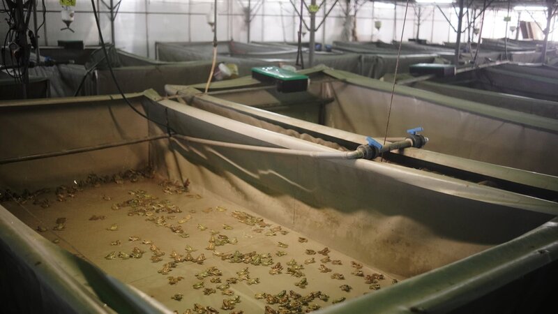 Ein erstes Ergebnis: ein Anstieg der Insekten und Mücken, was im ungünstigsten Fall sogar zu einer Verbreitung von Malaria führen könnte. Liegt in der Froschzucht die Lösung? In der Provence in Frankreich hat Patrice François die erste Froschfarm des Landes eröffnet. Ein schwieriges Unterfangen: Frösche fressen in der Regel nur Lebendfutter und lassen sich schwer aufziehen. Mittlerweile liefert François 150.000 Frösche im Jahr aus. Zu seinen Kunden zählen vor allem Sternerestaurants und Feinkostläden. Noch ist der Ertrag geringer als beim Wildfang. Doch der Unternehmer will zu einer Veränderung im Froschhandel beitragen. (Text: arte)