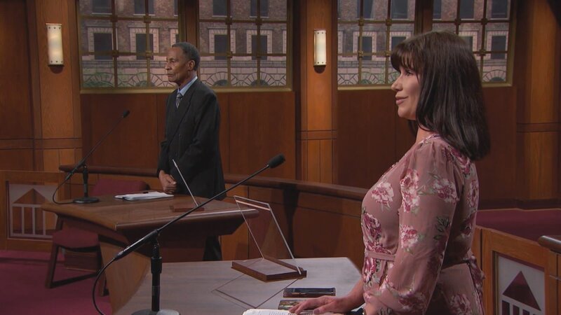 eine Frau und ein Mann stehen vor Gericht