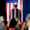 Donald Trumps Schatten hinter der amerikanischen Flagge, als er sich auf seinen Auftritt bei einer „Keep America Great“-Kundgebung im Santa Ana Star Center vorbereitet, Rio Rancho, USA, 2019